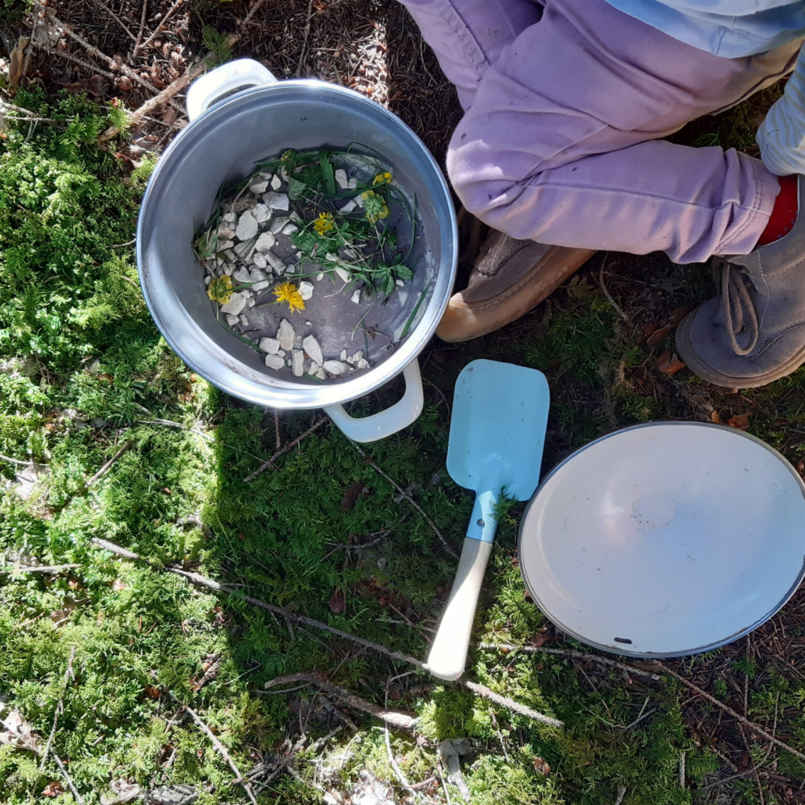 Die Spielmaterialien sind plastikfrei oder gebraucht. Der Raum ist strukturiert und übersichtlich gestaltet, um das Aufräumen und Wiederfinden von Materialien zu vereinfachen. Die Natur ist ein ebenso wichtiger Spielort wie drinnen.